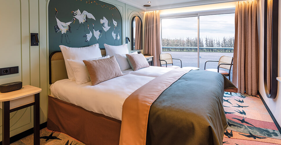 The interior design features Art Nouveau style in pink and green hues and a Danube Delta wildlife theme, with designs incorporating migratory birds throughout. The elegant lobby features a stunning mosaic representing the river and the places of interest that run along it created by artist Ann Bubis, while the ship’s corridors showcase hand-cut paper artworks by Andrew Malon.