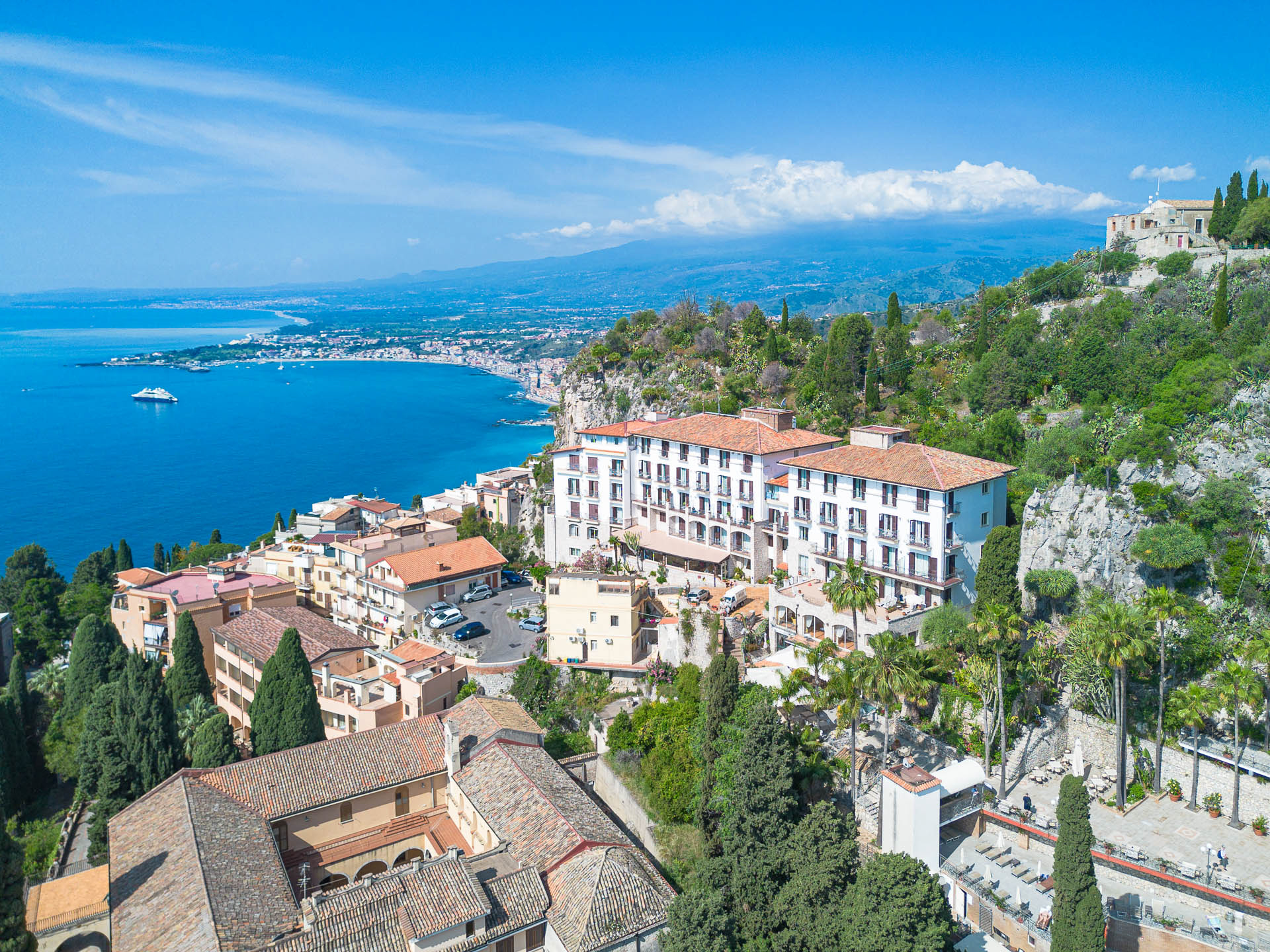 This hotel is just a 20-minute walk from Corso Umberto, Taormina’s main artery. And there’s a shingle beach at the bottom of the hill – there’s a cable car to take you down there.