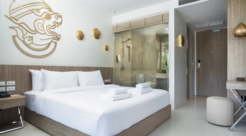 The Waters Khao Lak by Katathani promises peaceful stays. It boasts seven pools, and the beach is only five minutes’ walk away. The best thing about this hotel is the choice of pools. Some of them come with built-in loungers, so it’s easy to swap between relaxing and swimming. There’s a sandy beach nearby, too. Swim-up rooms are on offer at this place. Inside, the décor is modern, with splashes of coral-blue and pendant lighting. A flatscreen TV and a balcony or terrace comes as standard, too.